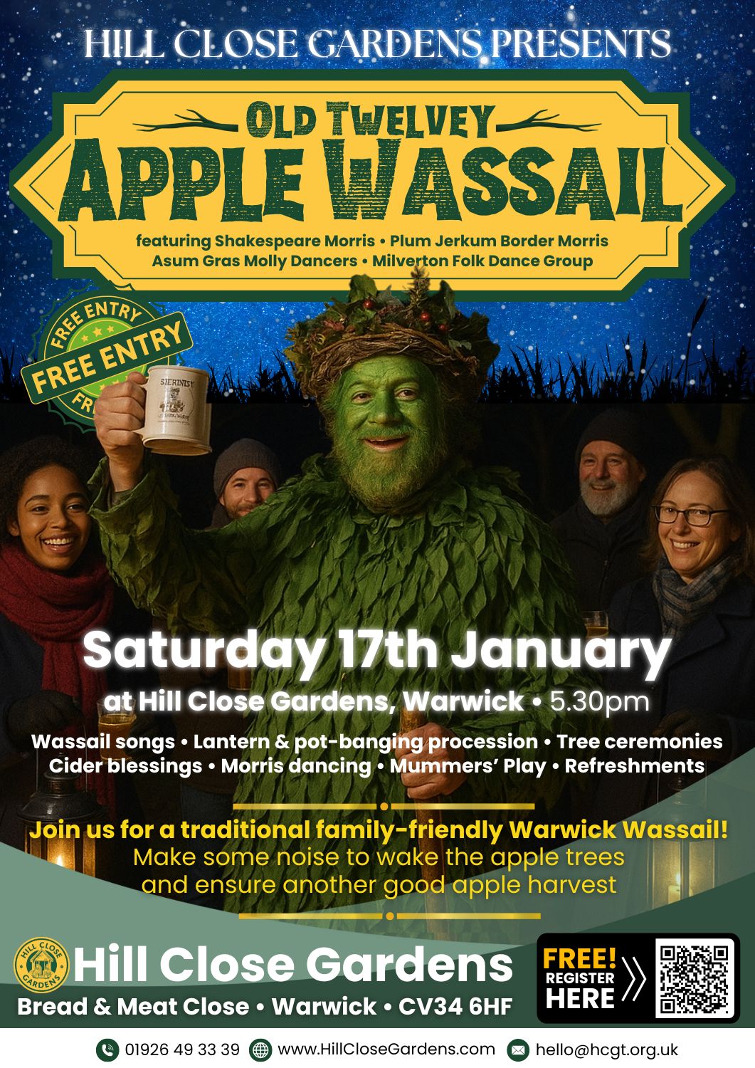 This will be a fabulous family friendly evening of Wassail songs, Morris dancing, lantern and drumming procession, tree ceremonies, cider blessing and a Mummers’ play.